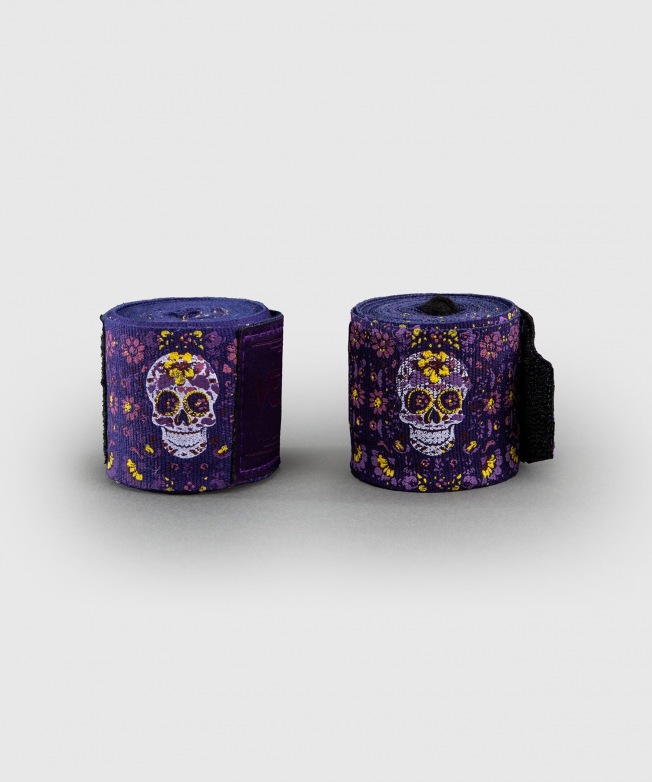 Эластичные фиолетовые боксерские бинты Venum Monogram Santa Muerte - Dark Purple длиной 2.5 метра подойду для детей, подростков и женщин, которые занимаются классическим и тайским боксом, кикбоксингом, мма и другими ударными видами спорта.