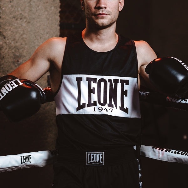Боксерская майка Леоне смотрится стильно и современно. Имеет прямой крой и производится из дышащего, сетчатого полиэстера, который помогает отводить влагу и осуществляет приток свежего воздуха к вашему телу.
