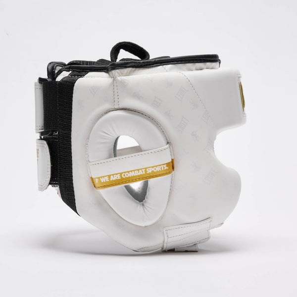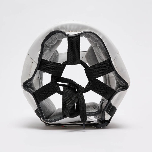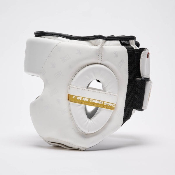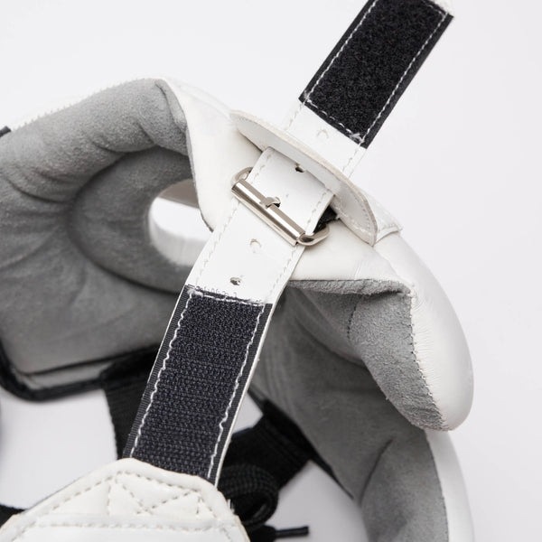 Белый шлем для бокса Леоне на голове фиксируется при помощи функциональной липучки, затягивающегося шнурка и застежки под подбородком, которые помогают более точно подогнать размер под параметры головы.