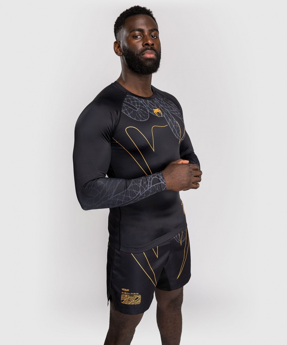 Рашгард Venum Serpenti LS - Black/Silver/Gold с длинным рукавом идеально подходит для занятий ММА (смешанными единоборствами), грэпплингом, джиу-джитсу, борьбой и другими видами единоборств.