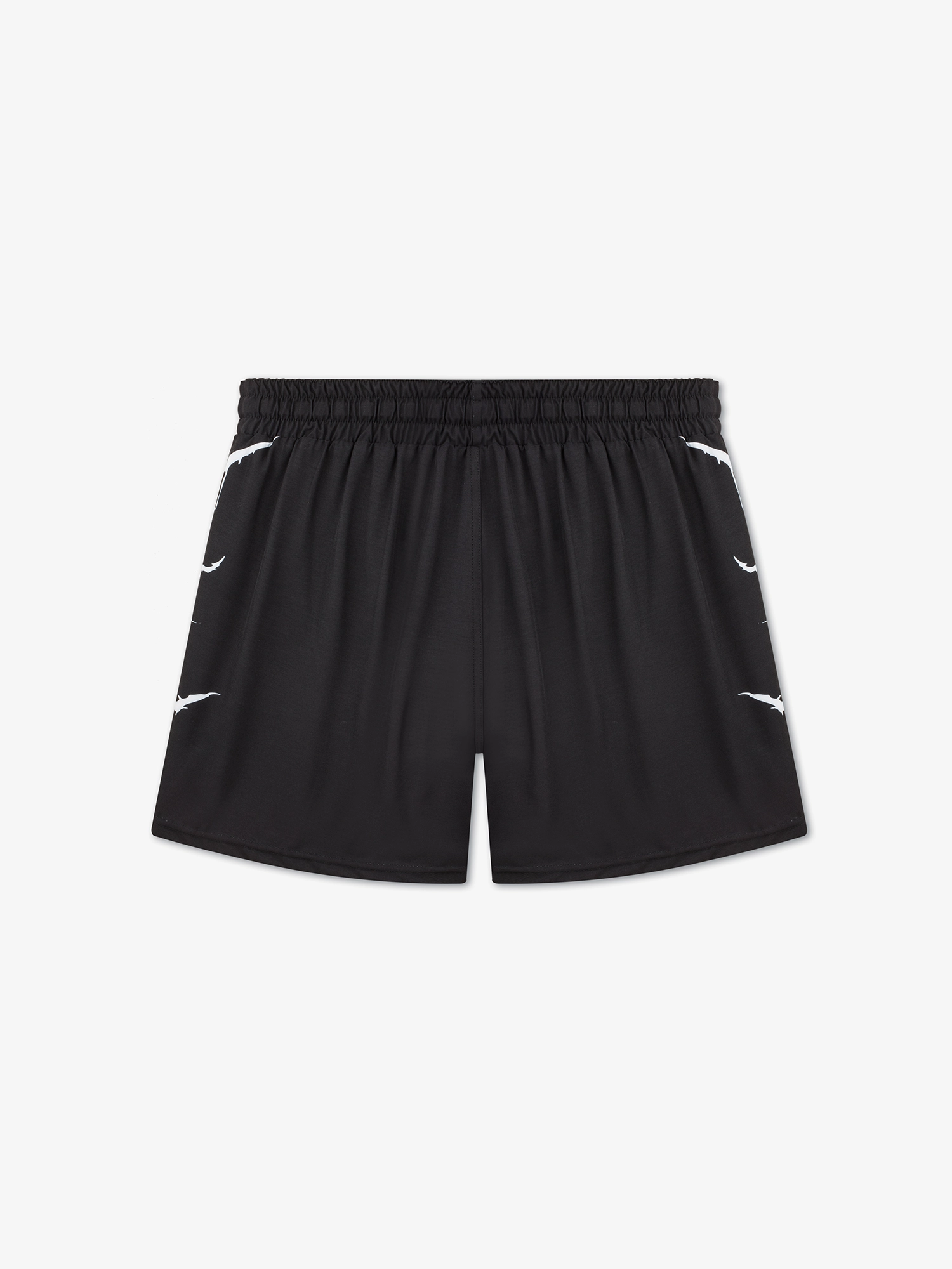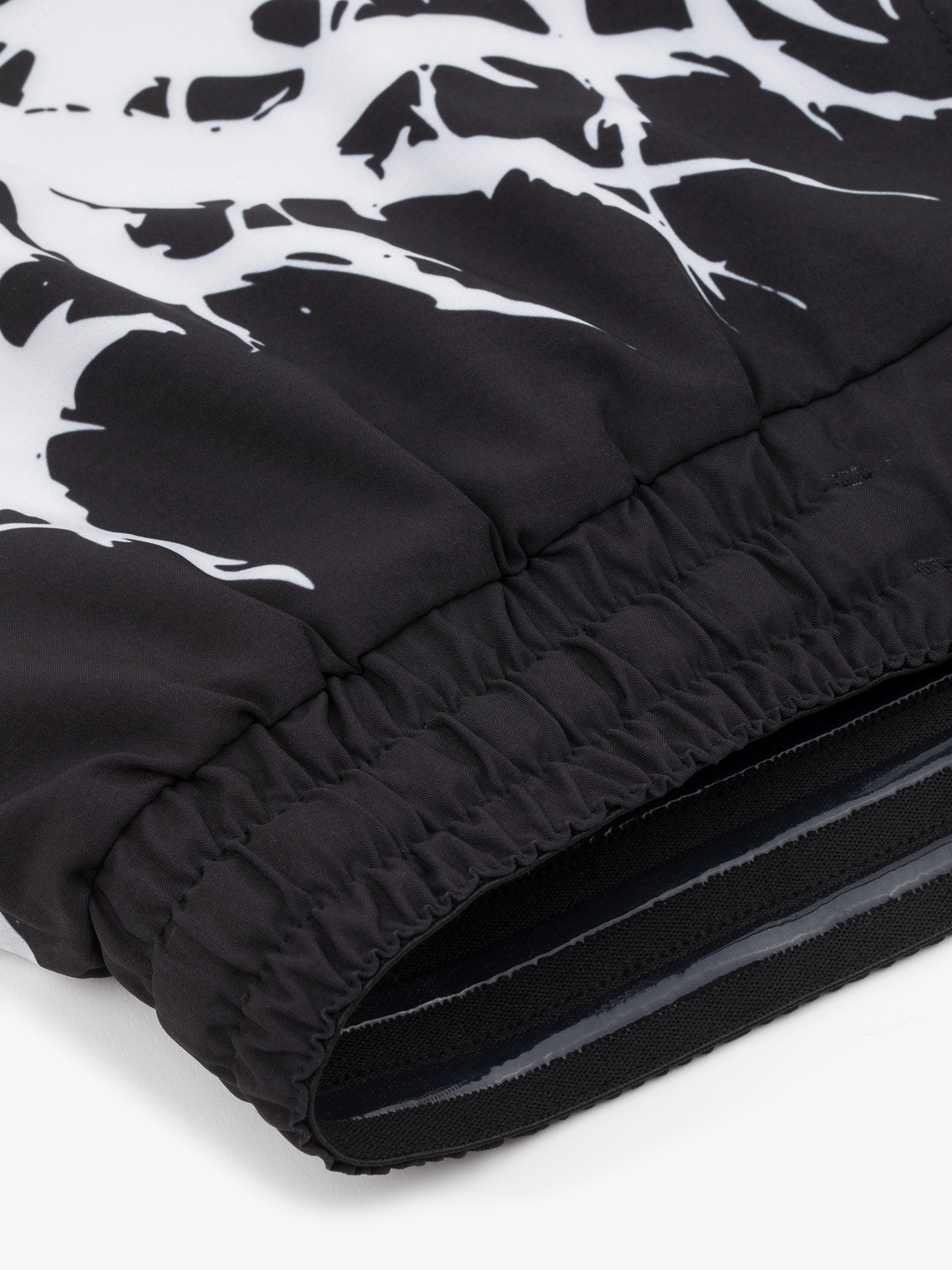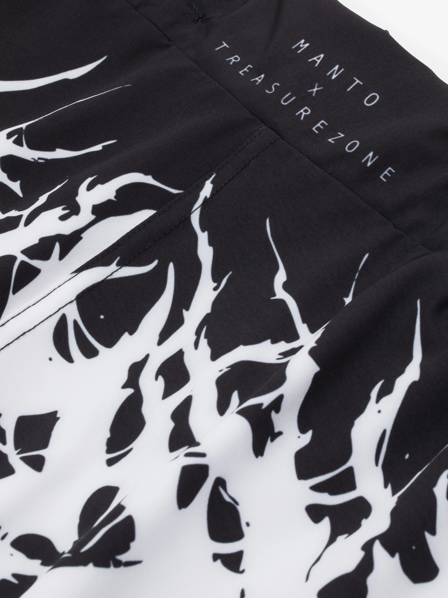 Принт на черных спортивных шортах Манто нанесен методом сублимации, при которой краска впитывается в сами волокна. Эта технология позволяет сохранять яркость и насыщенность принта, который разработан в коллаборации с Trezure Zone, а также не допускает появления на нём трещин.