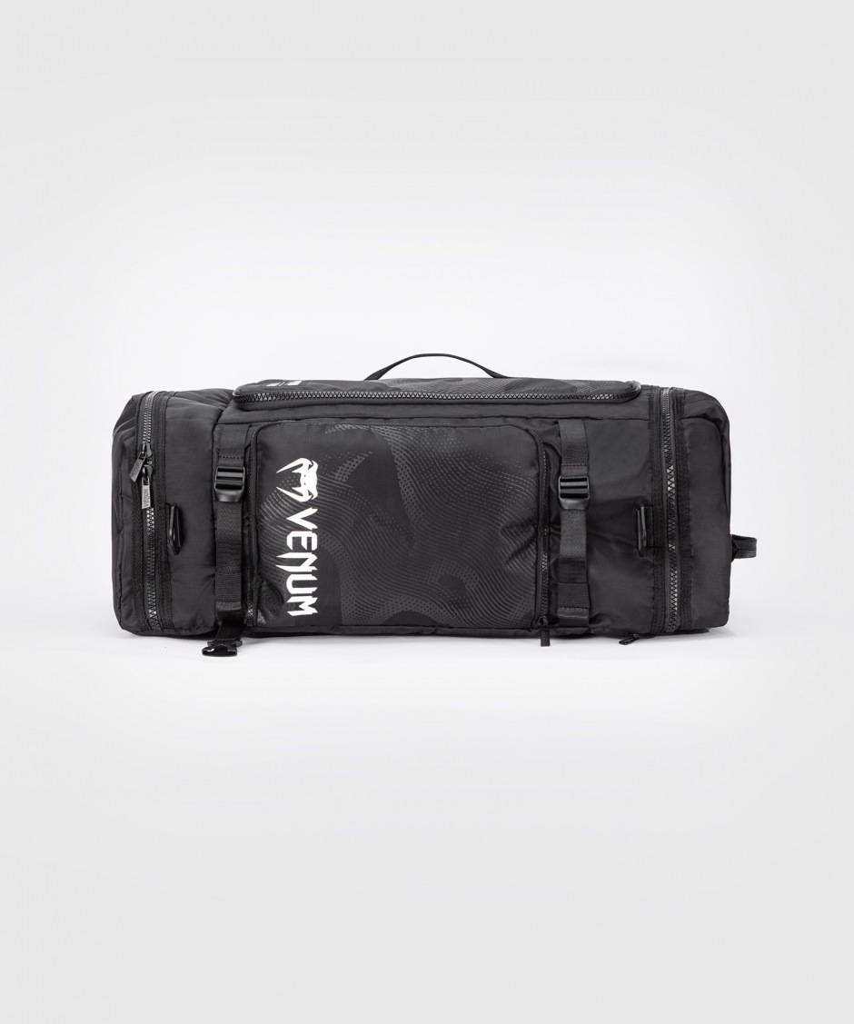 Черная сумка Venum Shockwave - Black (48L) имеет современный спортивный дизайн. На изделие нанесен принт в виде геометрических узоров, надписи и логотипа бренда.